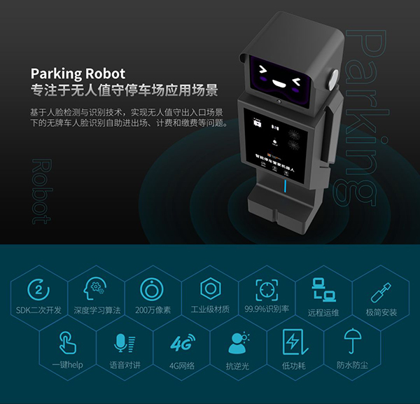 当(无牌)车辆驶入或驶出时,机器人可通过对驾驶员面部特征的检测与识别,快速抬杆放行,同时后台会自动比对两次识别结果并计算该车辆的停车时间及费用,车主只需出示或扫描屏幕上方的二维码即可完成费用支付顺利出场。赋能•无感•智慧的产品理念结合轻资产的管理运维模式,有效的推动了无人值守智慧停车时代的创新与发展。